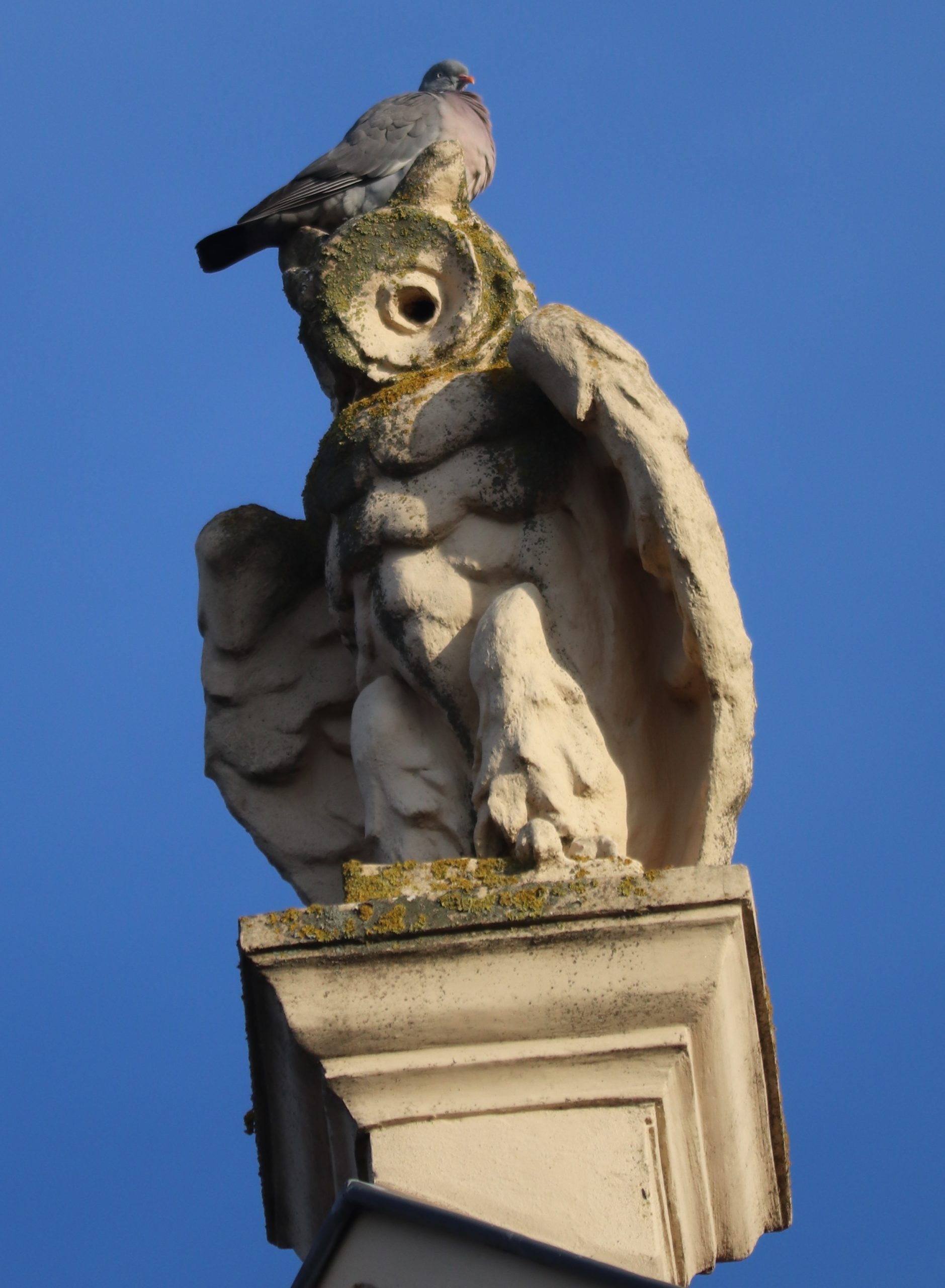 Die Taube richtet sich zu voller Größe auf, macht sich endlich flugbereit. Da senken sich die Kinderarme noch ein mal kurz, um der Taube noch etwas Energie mitzugeben, bevor sie sie in die Luft werfen und auseinander treten.