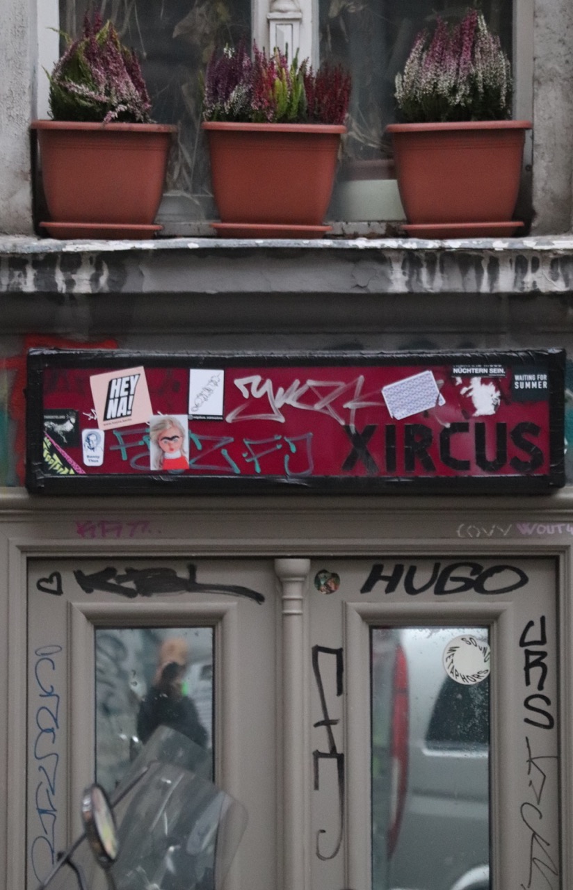 Statt all dessen verlegt er sich auf’s einfache Dokumentieren von kleinen Nebensächlichkeiten (man soll das machen, was man kann), denn für „große Kunst“ lässt sein Beruf ihm in den nächsten Tagen wenig, wenn auch nicht keine Zeit, und das ist sehr gut so, wegen sehr vielen Gründen: Auf dem Bahnsteig am Alexanderplatz werden sie von einem aufgeregten Star begrüßt, der aufgeregt zwischen ihnen hin und her fliegt, bis sie sich für eine der Treppen abwärts entschieden haben. Unten, im Schatten des Fernsehturms, ziehen Zeugen Jehovas ihre Rollwagen müde über den Alex, ein einzelner Kiffer hält gerade genug Abstand zu den Trampolinen, auf denen ziemlich alte Kinder hüpfen. – In Kreuzberg läuft der Kita-Betrieb in der Regenbogenfabrik noch auf Hochtouren, als sie ihre Rollkoffer durch den Hofeingang ziehen, erschrecken die Damen an der Rezeption. – An der East Side Gallery, am frühen Abend, joggt ein Mann an ihnen vorbei, er trägt einen Pizzakarton und knabbert, im Laufen, am vorletzten Stück. – Gegen neun Uhr passieren sie den Rio-Reiser-Platz, die Laternen beleuchten das Namensschild, außer dem Brillenträger und seiner Kollegin weiß niemand mehr, wer das mal war; die Kreuzung wirkt unheimlich friedlich; Montag Abend, willkommen in Kreuzberg. – Am Paul-Linke-Ufer suchen zwei junge Frauen nach einem „Homeless Guy“, der ihre Tasche gestohlen haben soll, der Brillenträger und seine Kollegin zucken mit den Schultern, schauen noch eine Weile dem Vorübertreiben von Geistern der Vergangenheit zu, und gehen dann zurück in die Regenbogenfabrik, die Kinder müssen ins Bett. Es dauert nicht länger als erwartet, bevor sich die Aufregung des ersten Tages gelegt hat; die Nachttemperaturen sind erfreulich mild, eine dünne Decke reicht.