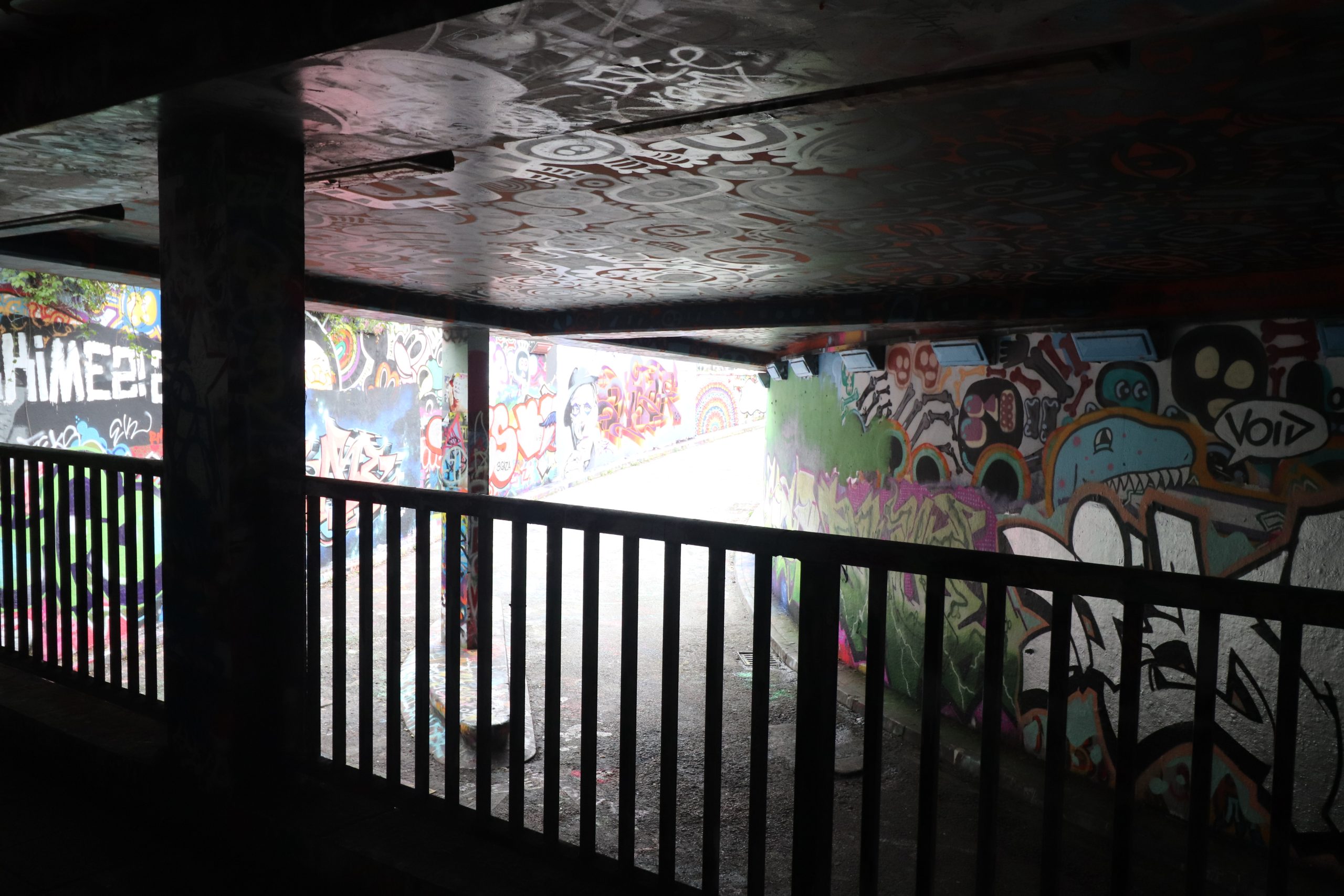 Eine Stunde und viele Busminuten später blieben sie am Eingang zum Graffiti Tunnel kurz stehen. Unheimlich ging sicher anders, so viel Betriebsamkeit wie hier herrschte, aber Tunnel bleiben Tunnel, egal in wie viele verschiedene Farben sie getaucht sind. An der ausgeleuchteten Decke waren riesige Portraits zu sehen. Ein Frauengesicht, eingefasst in hunderte geschwungene Namenszüge: Jesus. Einige Meter weiter ein weiteres Frauengesicht, maskiert und durch die Deckenleuchten in der Mitte geteilt, so dass die Augen von der Mitte aus angestrahlt wurden. In einem Nebentunnel fanden sie hinter Plexiglas das Schwarz-Weiß Bild eines Panzers, über den in riesigen Lettern Carnival geschrieben war. Nicht weit davon ein frischer Schriftzug: Free Gaza from Hamas! Sie suchten das Licht am anderen Ende des Tunnels und traten in den leichten Nieselregen, wo die Menschen sich wieder angenehmer verteilten.